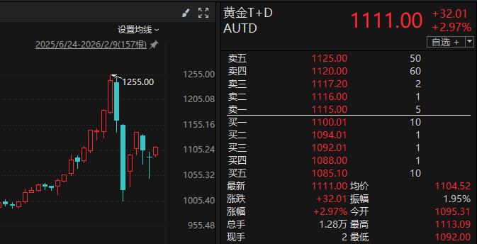 近期,黄金市场呈现波动状态。东方财富显示,黄金T+D最新价为1111元/克,较前一交易日上涨32.01元,涨幅达2.97%。但相较近期1255元/克的高点,跌去了11.47%;国内期货市场中,沪金主连最新价为1114.5元/克,相较近期1258.72元/克的高点,跌去了11.46%。