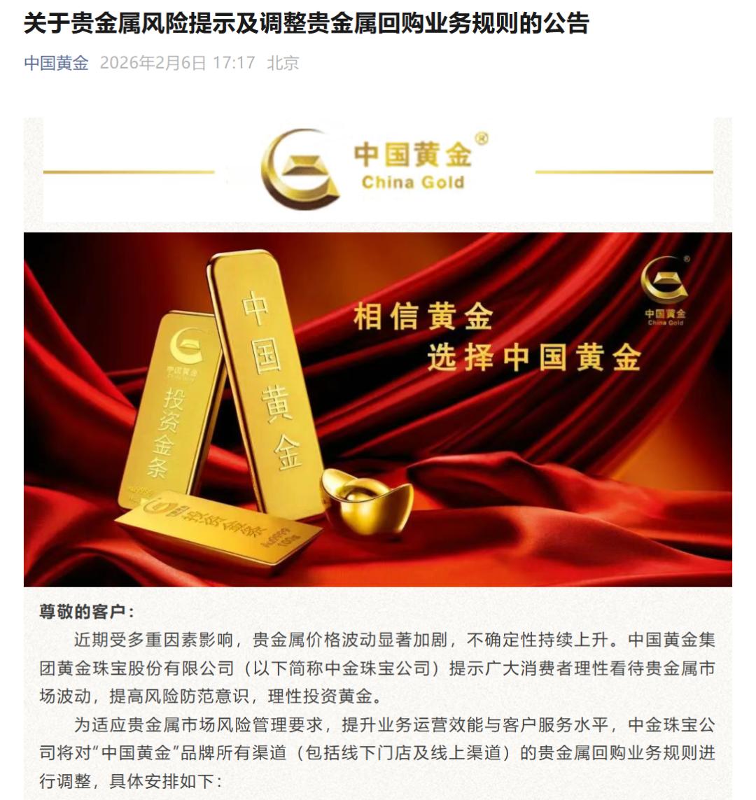 中国黄金于公告中表示,近期受多重因素影响,贵金属价格波动显著加剧,不确定性持续上升。公司提示广大消费者理性看待贵金属市场波动,提高风险防范意识,理性投资黄金。为适应贵金属市场风险管理要求,提升业务运营效能与客户服务水平,公司将对“中国黄金”品牌所有渠道(包括线下门店及线上渠道)的贵金属回购业务规则进行调整。