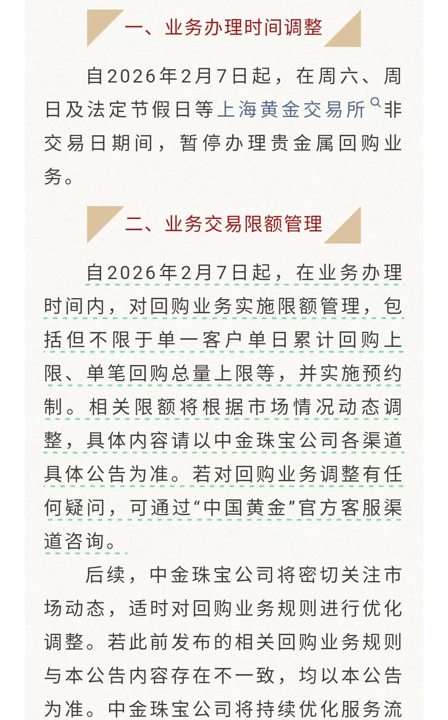 中国黄金公告显示,自2026年2月7日起,在业务办理时间内,对回购业务实施限额管理,包括但不限于单一客户单日累计回购上限、单笔回购总量上限等,并实施预约制。相关限额将根据市场情况动态调整,具体内容以公司各渠道具体公告为准。