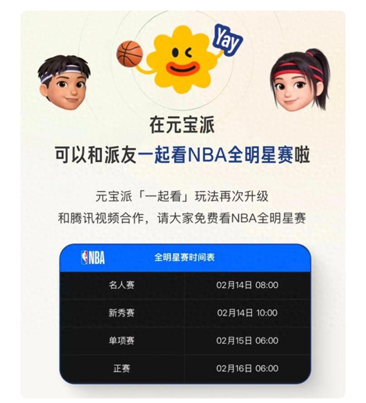 2月11日,腾讯宣布元宝派正式上线“一起看NBA全明星赛”专题活动,覆盖名人赛、新秀赛、单项赛及全明星正赛四场赛事。2月14日至16日期间,用户可在元宝派内与好友同步观看2026年NBA全明星赛直播,并支持用大模型进行球员数据查询、赛事规则解读及战术分析等AI互动。